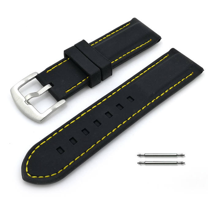 Black Silicone 20mm Watch Band Strap Steel Buckle Yellow Stitching #4005
