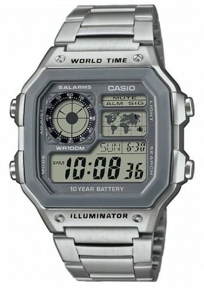 The Casio AE1200WHD 7AV is a classic world time digital watch combining durable build and versatile functions. It features a stainless steel band with a secure foldover clasp, and a resin case that houses a precise quartz movement with long battery life. The world map display lets you easily switch between 48 cities in 31 time zones, ideal for travel, work, or everyday use.