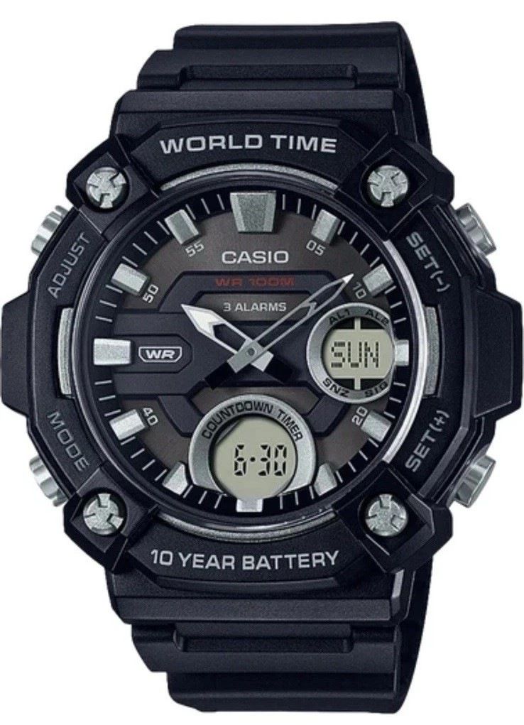 The Casio AEQ120W 1AV is a rugged analog-digital combination watch blending classic style with advanced functionality. It offers a durable resin case and band, 100 meter water resistance, and a long life 10 year battery for reliable everyday wear.
