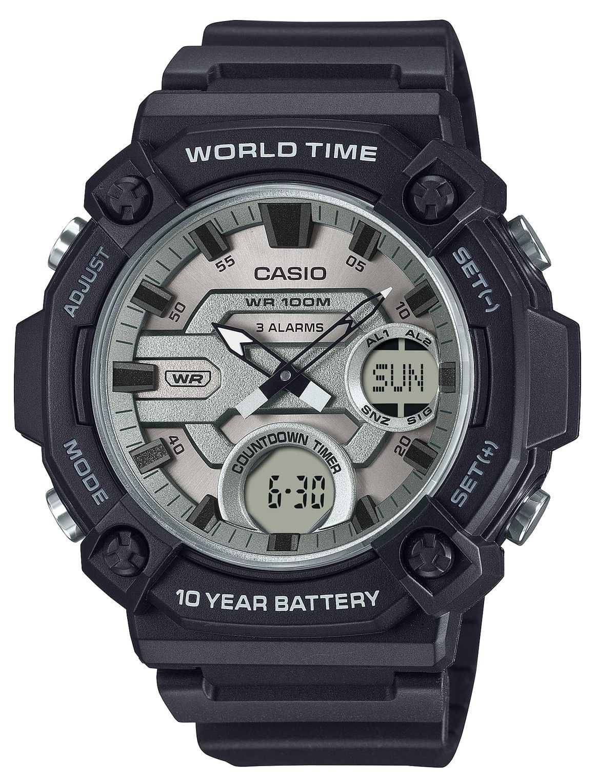 The Casio AEQ120W 7AV is a rugged analog-digital watch built for travel, everyday wear, or active use. It features a durable resin case and resin strap, 100 meter water resistance, and a long life 10 year battery for dependable performance.
