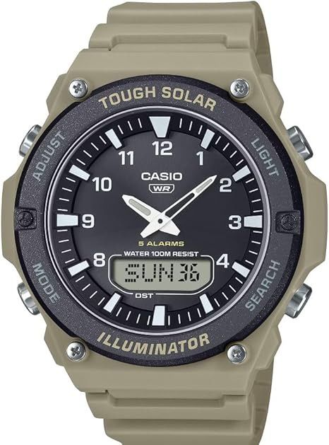 The Casio AQ-S820W 5AV is a versatile solar powered analog-digital watch delivering world time, dual timers, long battery life and reliable 100 meter water resistance. Its resin case and resin strap make it lightweight and durable, ideal for everyday wear, travel or outdoor activities.