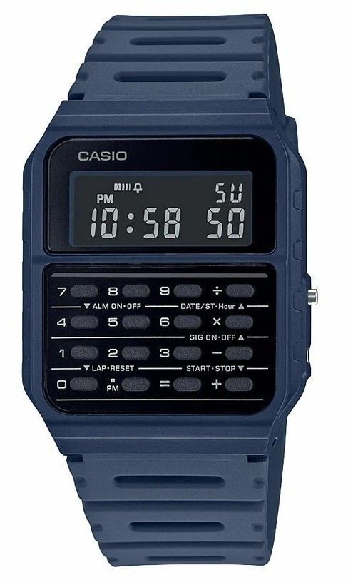 The Casio CA53WF 2B is a retro-style digital calculator watch that combines classic 1980s charm with everyday utility. It features a resin case and resin strap, a compact slim profile, and a built-in 8-digit calculator for basic math on the go. The watch is lightweight and water resistant, making it ideal for daily wear.