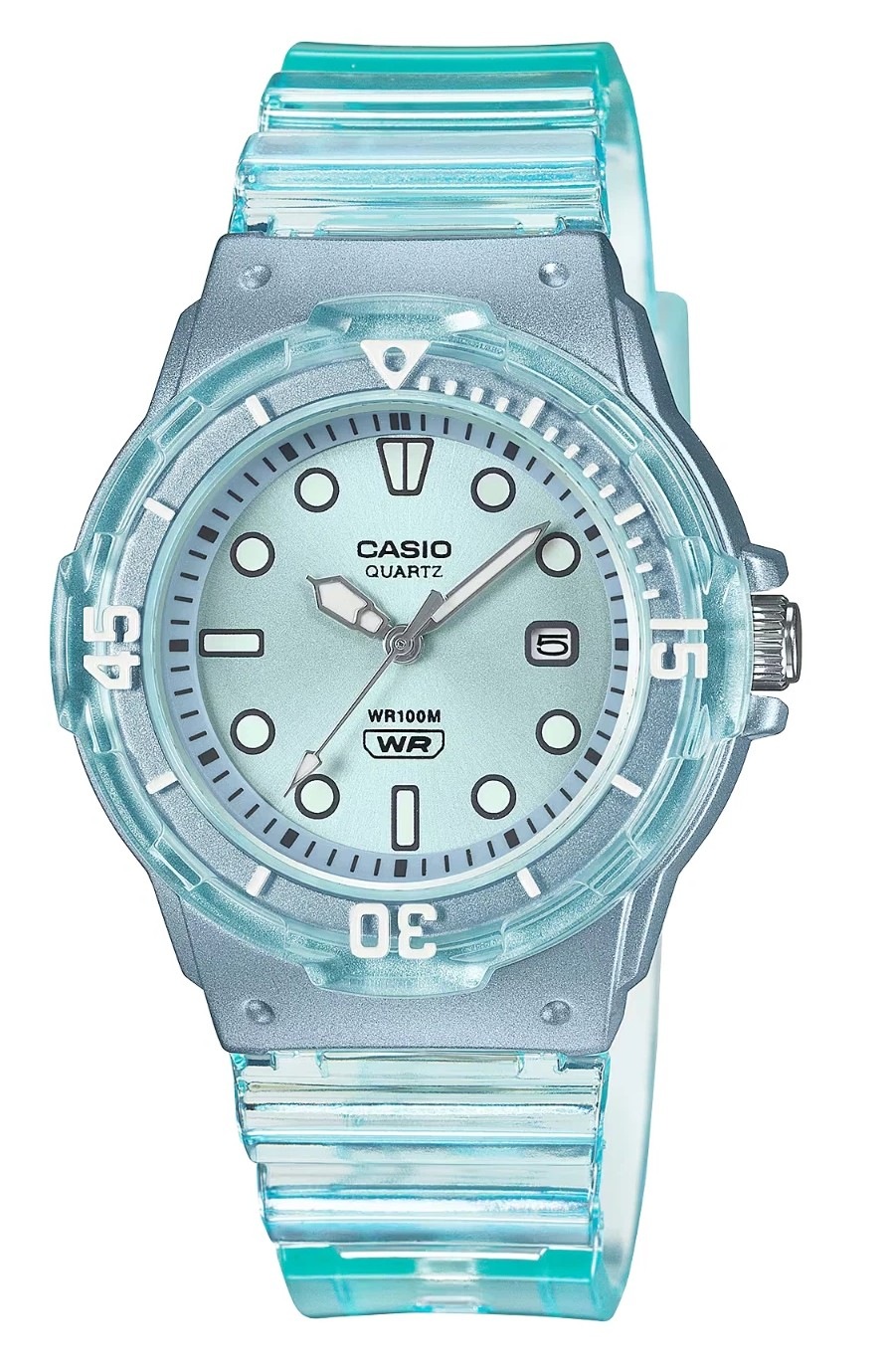 The Casio LRW-200HS-2EV is a compact analog resin watch featuring a translucent band and bezel with a blue dial, combining sporty dive-inspired styling with everyday durability and simplicity.