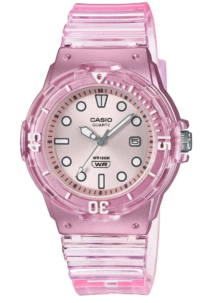 The Casio LRW-200HS-4EV is a stylish analog watch with a transparent resin case and band, designed for women and built for everyday wear including swimming or water exposure.