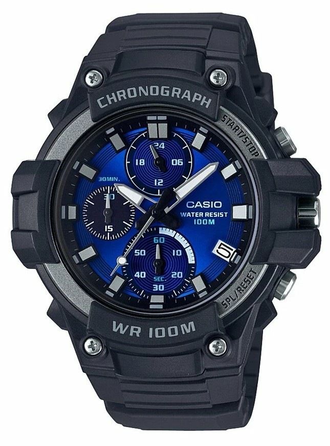 The Casio MCW-110H-2A2V is a rugged analog chronograph watch featuring a black resin case and band with a blue dial - combining practical chronograph functions and solid water resistance for everyday and active wear.