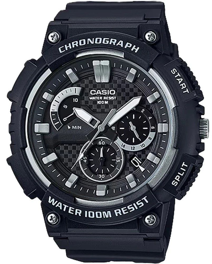 The Casio MCW-200H-1AV is a durable analog chronograph watch with a black resin case and strap, built for everyday wear and water exposure up to 100-meter depth. Its sporty yet classic design makes it a versatile choice for casual or active use.