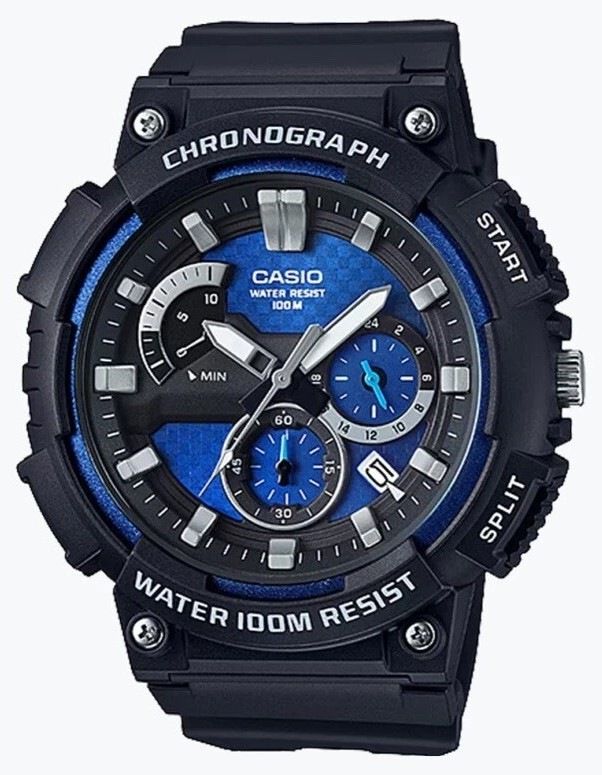 The Casio MCW-200H-2AV is a rugged analog chronograph watch with a durable resin case and band, designed for men and built for active everyday use - including swimming and water exposure up to 100 meters.