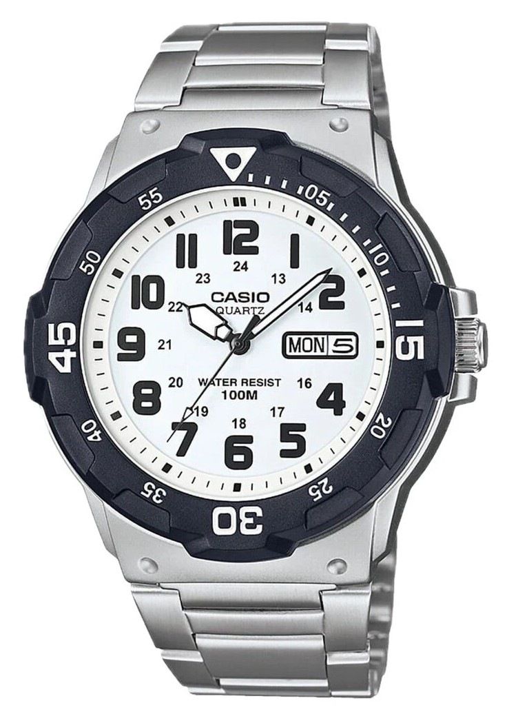 The Casio MRW-200HD-7BV is a robust dive-style analog watch with a stainless steel band and resin case, built for reliability and everyday wear - with 100-meter water resistance and day/date display for maximum utility.