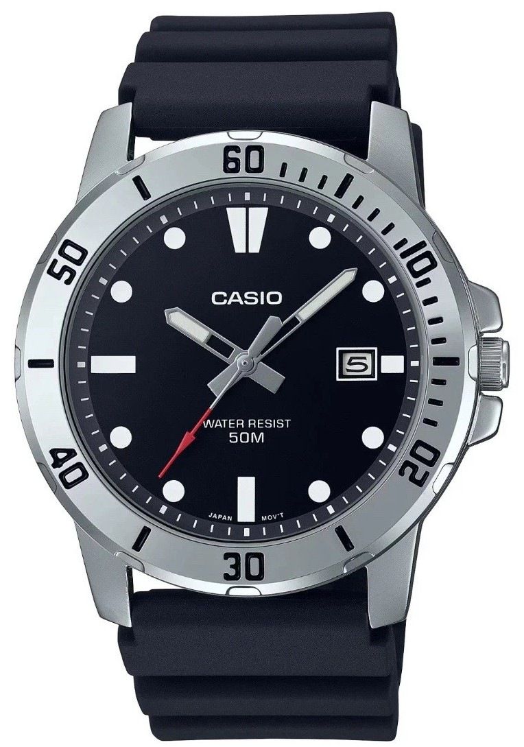 The Casio MTP-VD01-1EV is a sporty analog watch that combines a classic look with reliable everyday performance, featuring a black resin band, mineral glass and 50 meter water resistance - a great companion for daily wear or casual outings.