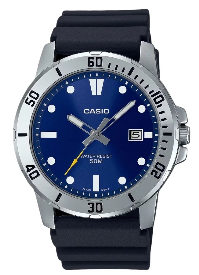 The Casio MTP-VD01-2EV is a simple, sport-style analog watch with a blue dial and resin strap - ideal for everyday wear with reliable timekeeping and modest water resistance.