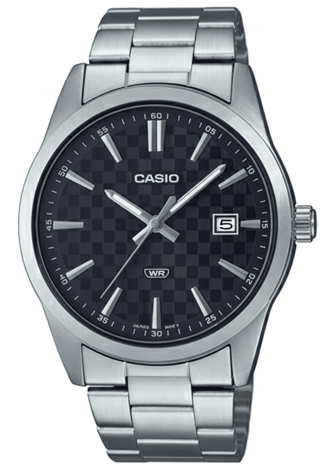 The Casio MTP-VD03D-1A is a clean, classic analog watch built with a stainless steel case and bracelet, ideal for everyday wear. With a simple three-hand dial and date display, it's a reliable, no-frills timepiece that fits both casual and formal settings.