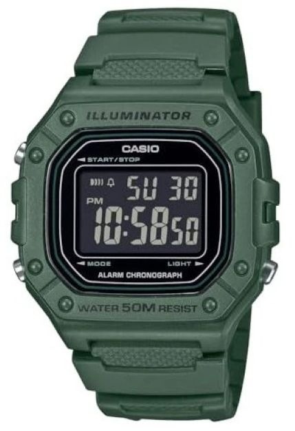 The Casio W-218H-3BV is a simple, reliable digital watch - featuring a matte-green resin case and strap, built for everyday wear with water resistance, long battery life and essential time functions. Compact, lightweight, and easy to read, it's designed to deliver practical performance day after day.