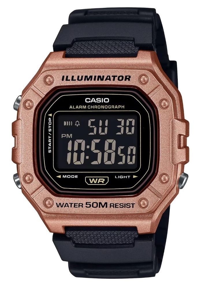 The Casio W-218HM-5BV is a durable and practical digital watch with a black resin case and strap, featuring a contrasting bronze-tone digital display. Designed for everyday wear, it offers water resistance, useful time functions, and long battery life - ideal for casual use, outdoor activity, or as a reliable daily timepiece.