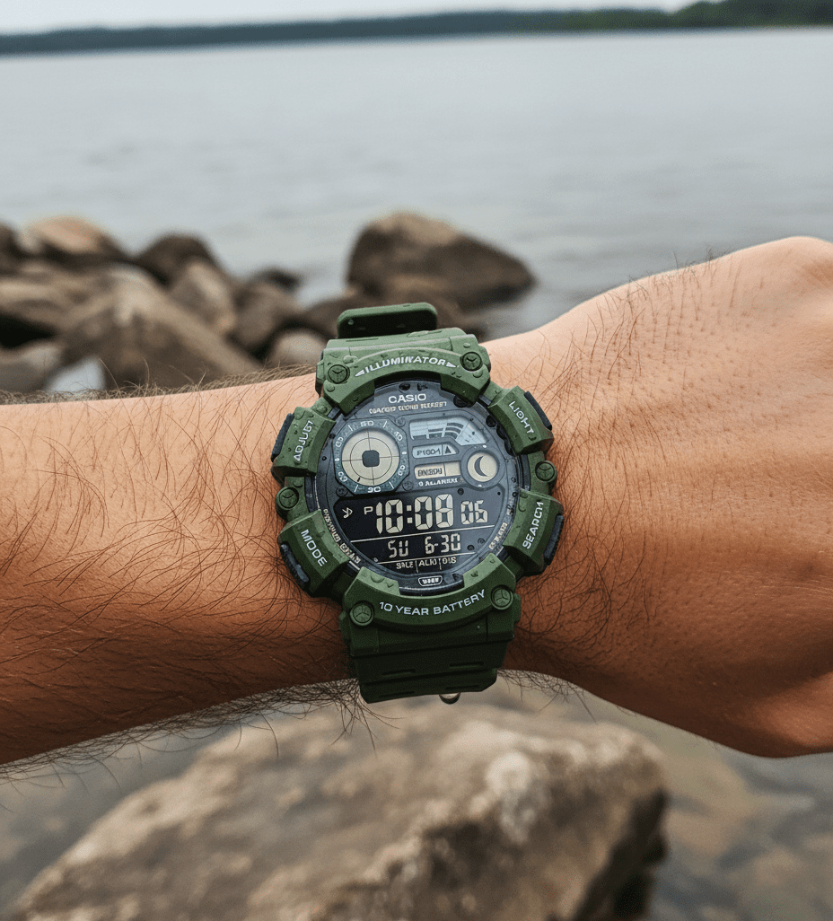 The Casio WS-1500H-3BV is a tough, feature-rich digital watch built for outdoor use, especially water sports. With Tide Graph and Moon Phase data, this model is perfect for surfing, fishing, and swimming. It boasts a large, easy-to-read display, dual time zones, stopwatch, countdown timer, and 10-year battery life. The rugged green resin band and 100M water resistance make it a reliable companion for anyone living an active lifestyle on or near the water.