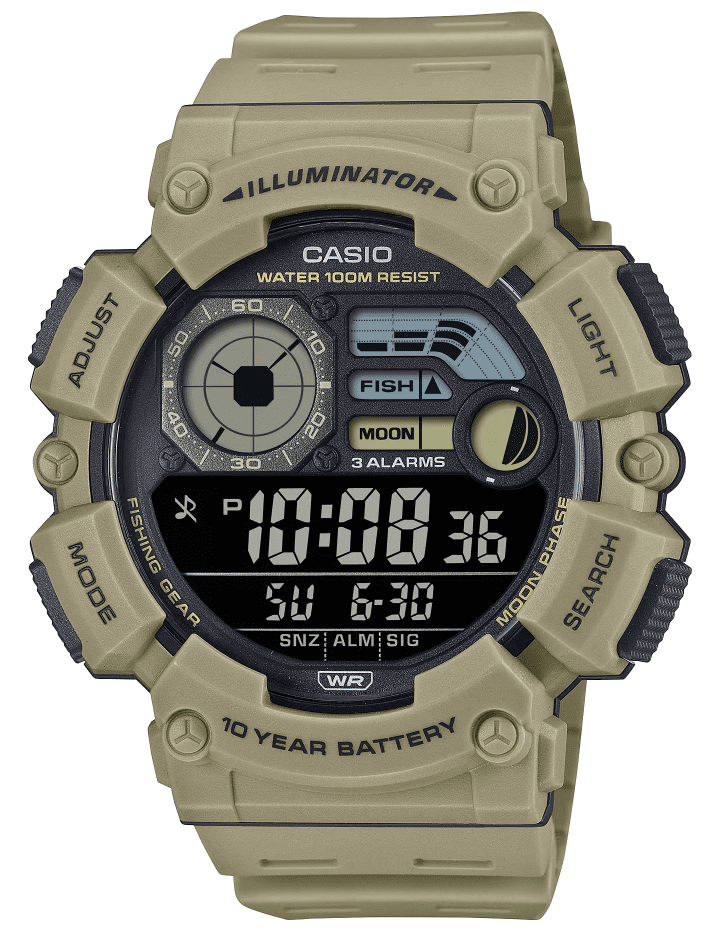 The Casio WS-1500H-5BV is a tough, high-performance digital watch designed for outdoor activity and water sport enthusiasts. It features tide graph and moon phase tracking, making it perfect for surfers, kayakers, and anglers. A long-lasting 10-year battery, 100-meter water resistance, and a large, easy-to-read screen make it practical and durable. The rugged brown resin case and strap give it a down-to-earth utility vibe that looks great on land or sea.