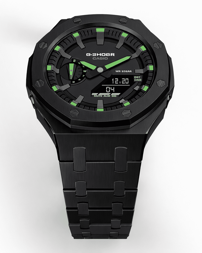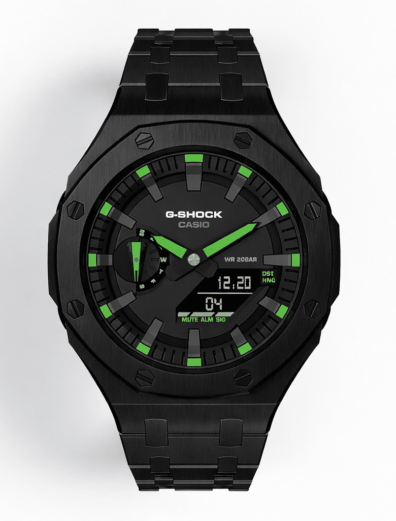 • Casioak Mod Watch Casio G-Shock GA-2100 Black All Metal Steel Modded Green GA2100-1A3