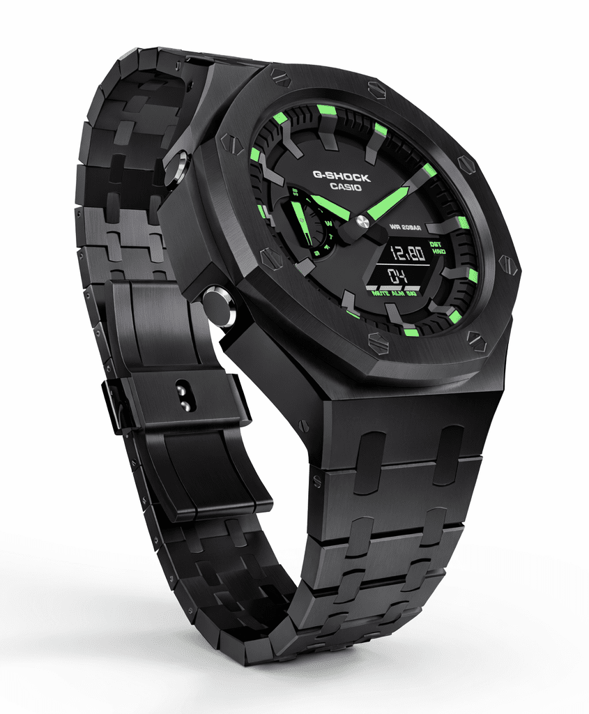 Casioak Mod Watch Casio G-Shock GA-2100 Black All Metal Steel Modded Green GA2100-1A3