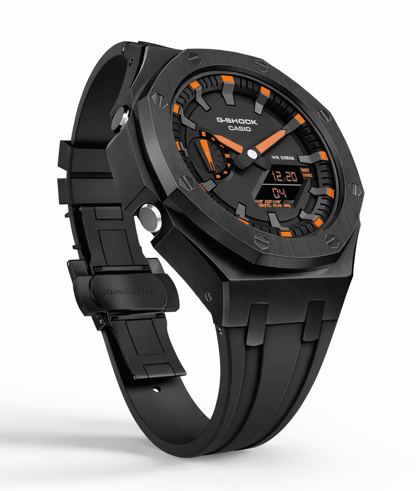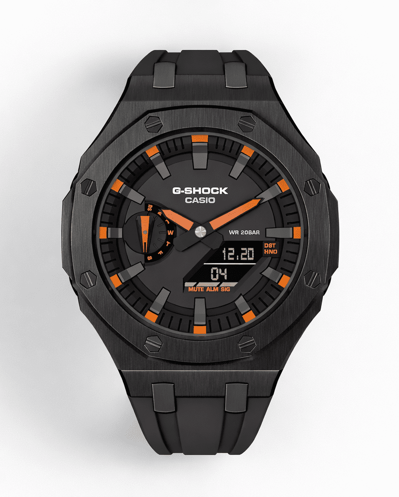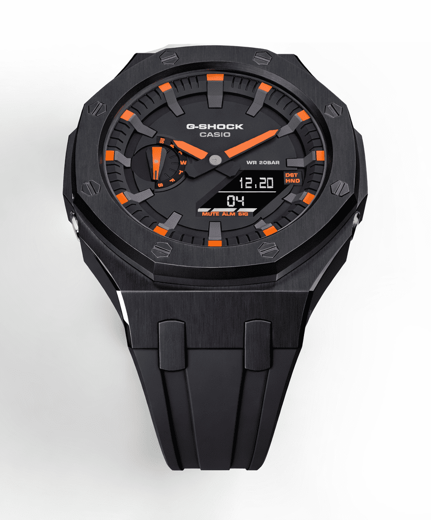 Casioak Mod Watch Casio G-Shock GA-2100 Black Metal Case Strap Modded Orange GA2100-1A4