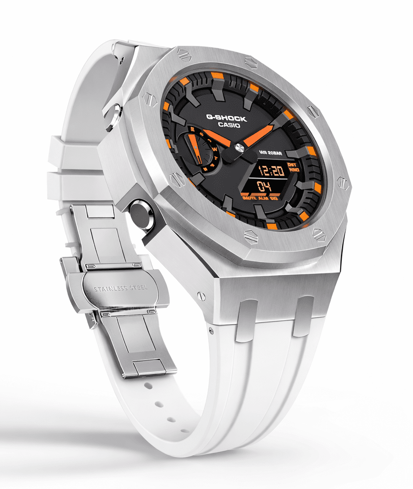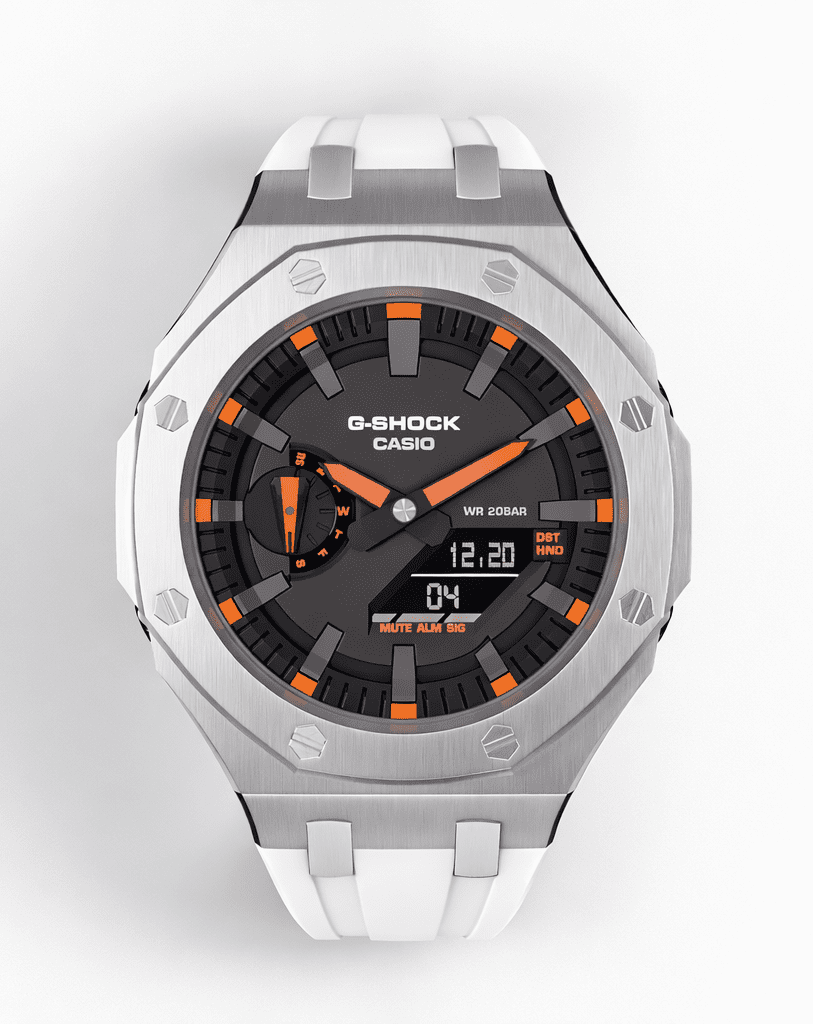 Casioak Mod Watch Casio G-Shock GA-2100 Silver Case White Strap Modded Orange GA2100-1A4