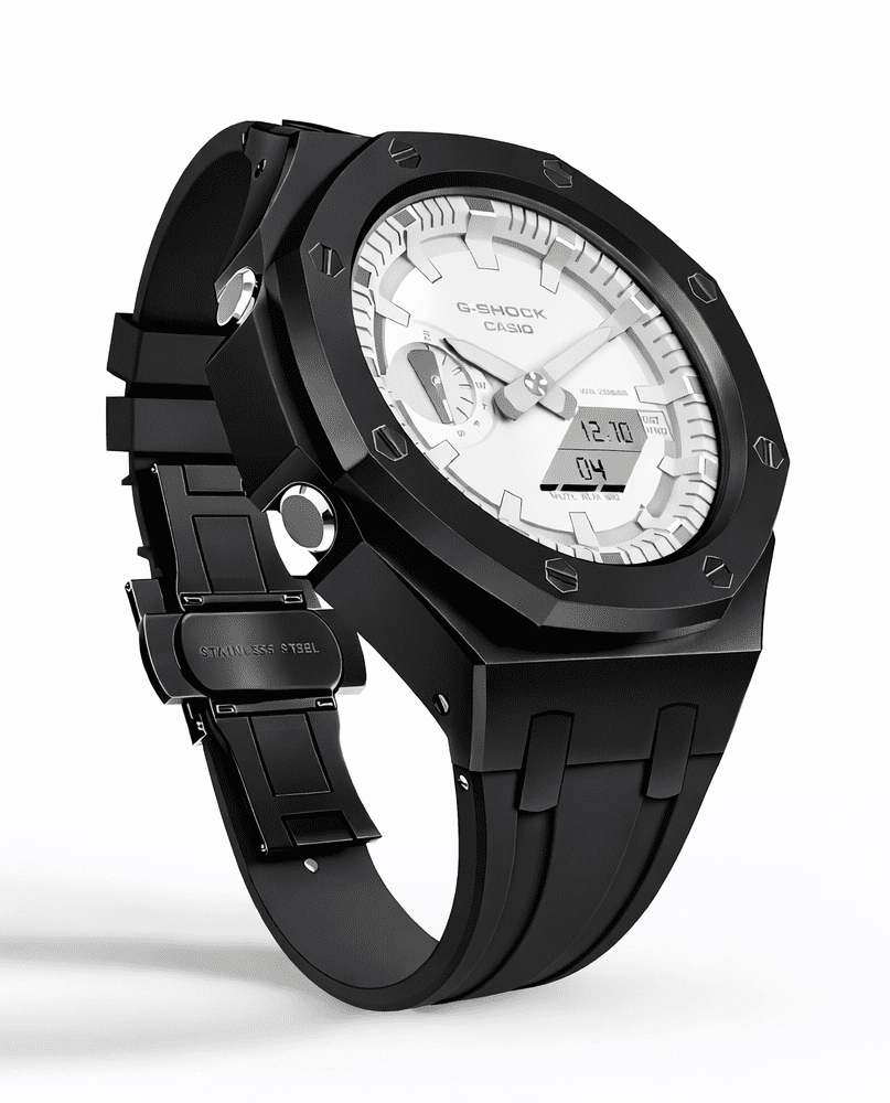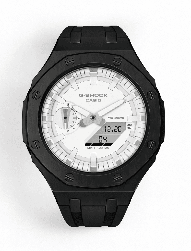 Casioak Mod Watch Casio G-Shock GA-2100-7A7 White Dial Black Metal Case Strap Modded GA2100