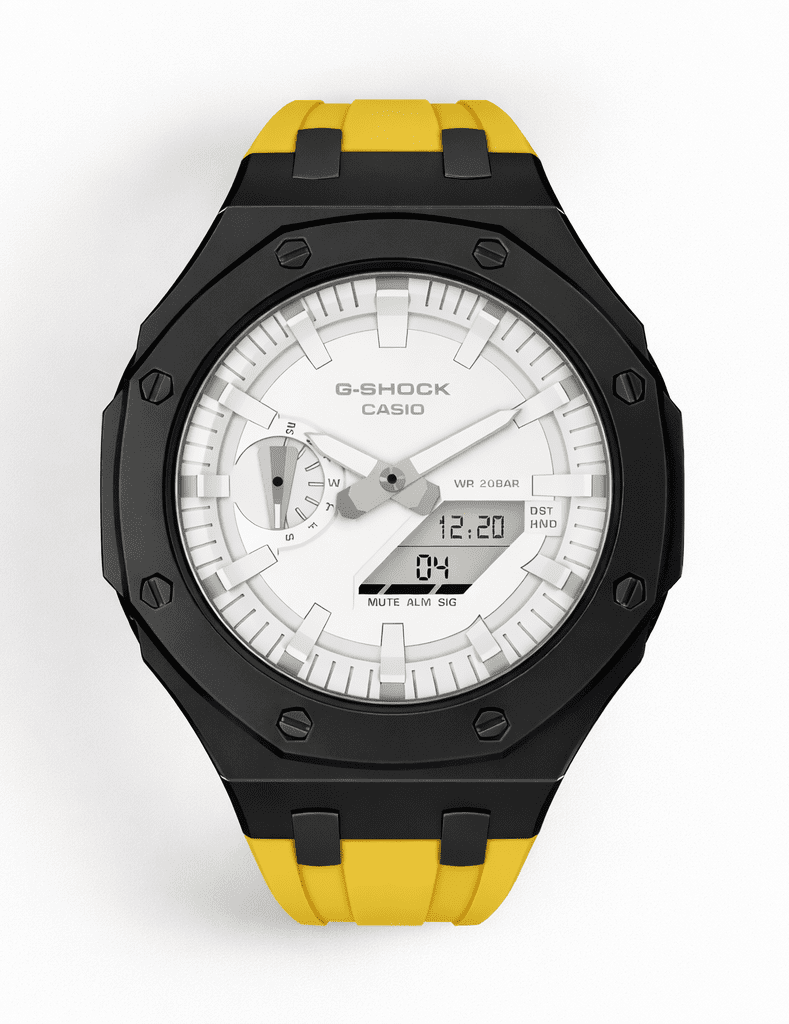 Casioak Mod Watch Casio G-Shock GA-2100-7A7 White Dial Black Case Yellow Strap Modded GA2100