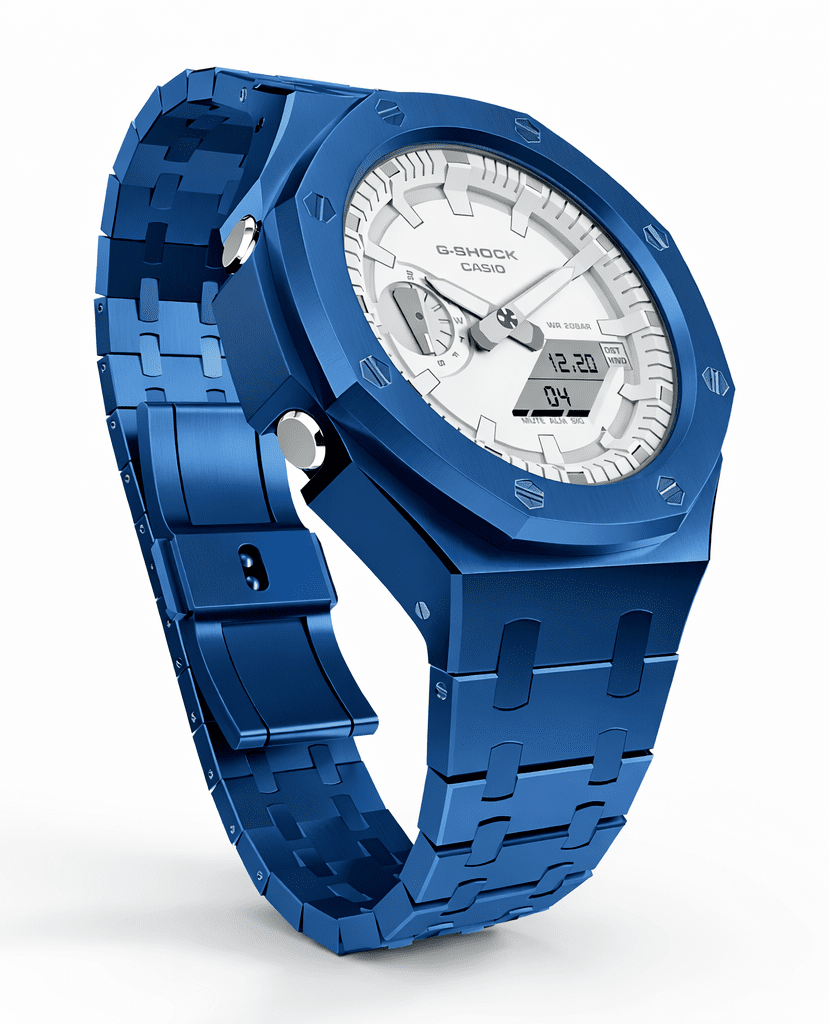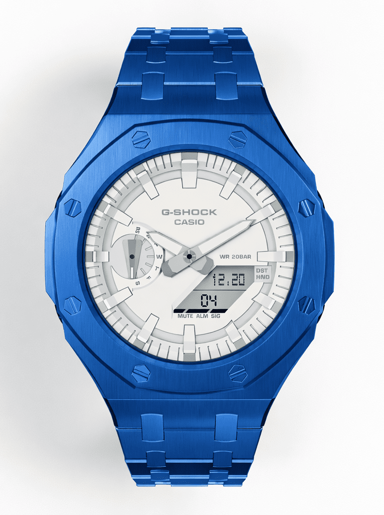 Casioak Mod Watch Casio G-Shock GA-2100-7A7 White Dial Blue Case Metal Strap Modded GA2100