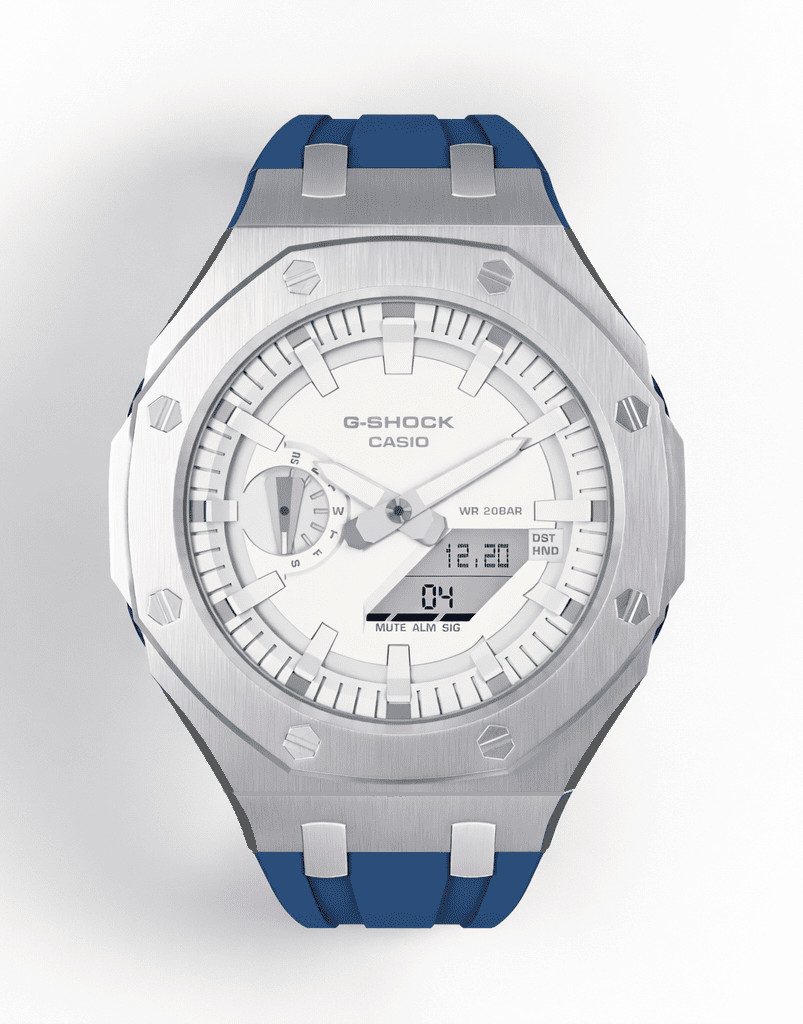 Casioak Mod Watch Casio G-Shock GA-2100-7A7 White Dial Silver Case Blue Strap Modded GA2100