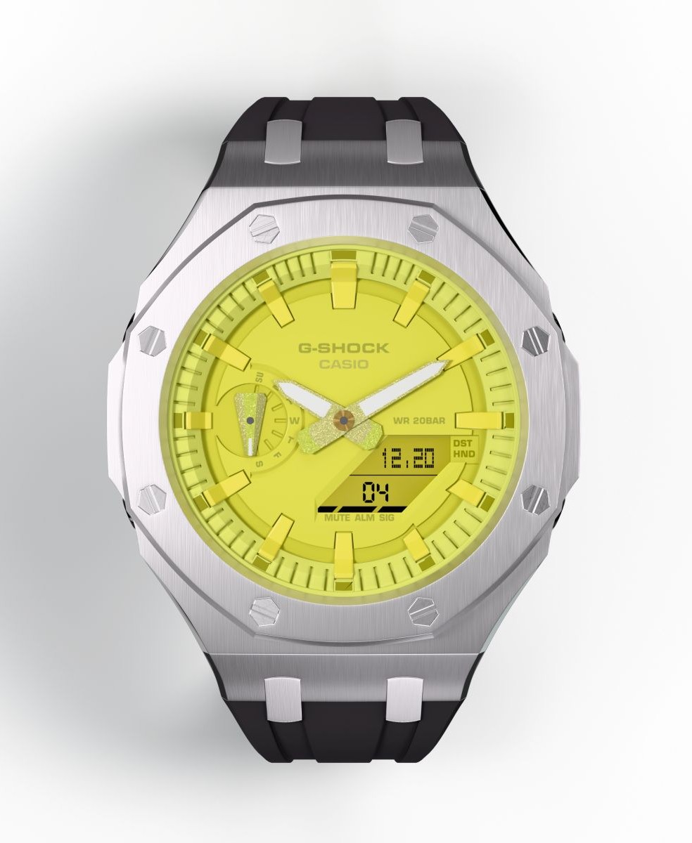 • Casioak Mod Custom Yellow Dial Watch Casio G-Shock GA-2100-9A9 Silver Metal Case Black Strap GA2100