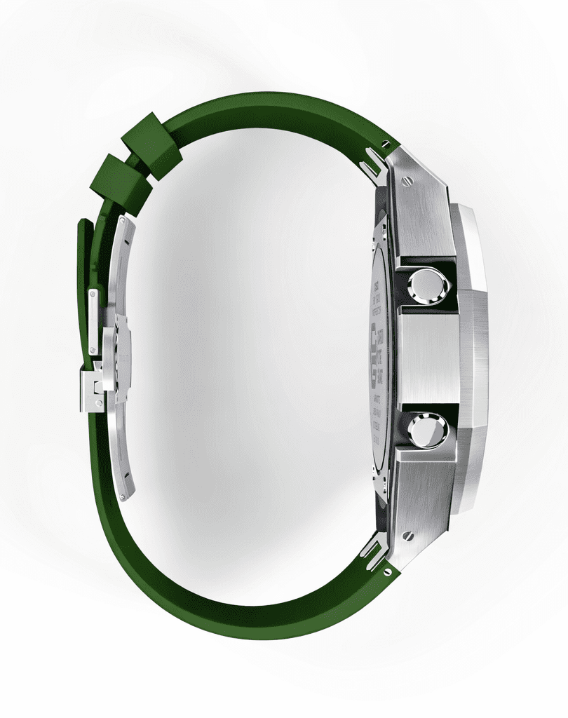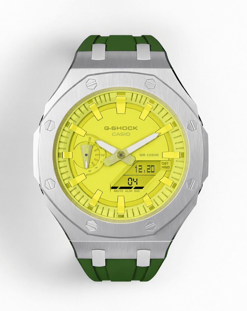 • Casioak Mod Custom Yellow Dial Watch Casio G-Shock GA-2100-9A9 Silver Case Green Strap Modded GA2100