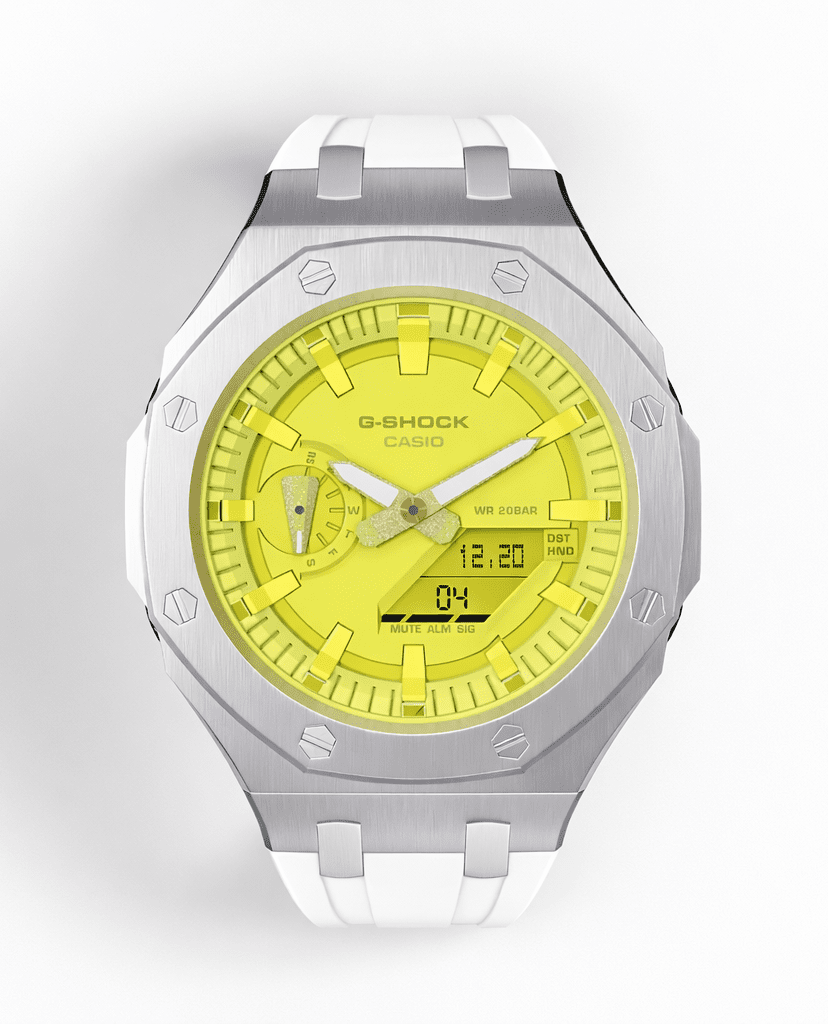 • Casioak Mod Custom Yellow Dial Watch Casio G-Shock GA-2100-9A9 Silver Case White Strap Modded GA2100