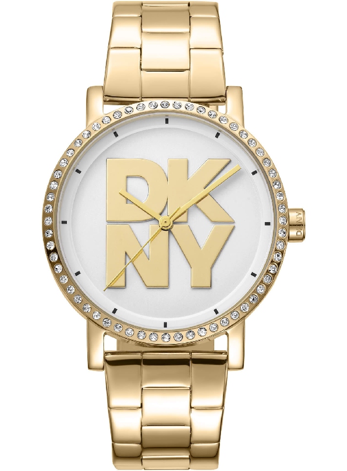 • Women's DKNY Soho Logo Stainless Steel Gold Crystalized Case Watch DK1L035M0055