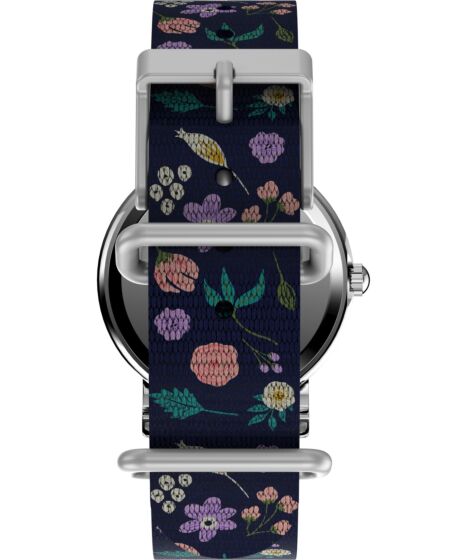 This Timex watch features a reliable quartz analog movement with a clear white dial, playful Peanuts Snoopy and floral motifs and INDIGLO light up watch dial.