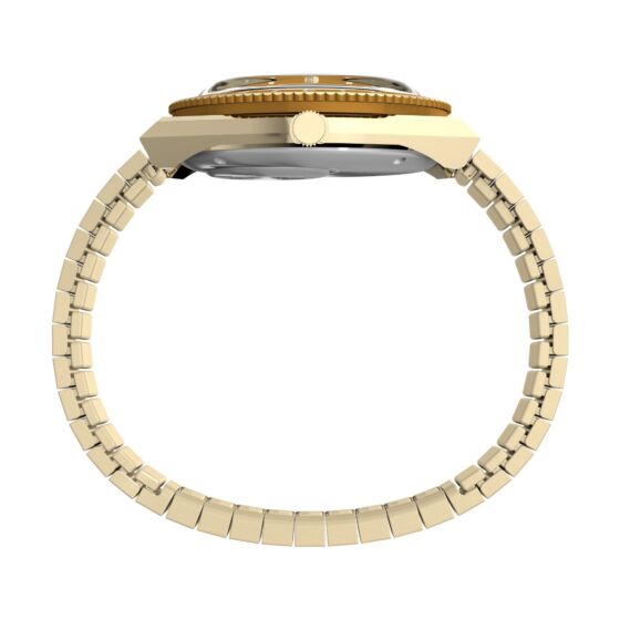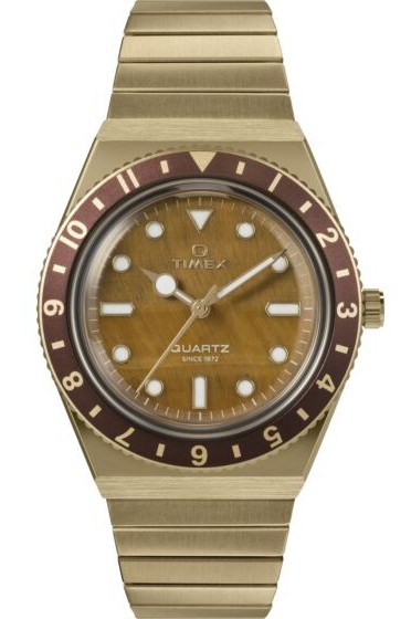 This Timex watch features a reliable quartz analog movement with a brown tiger eye stone dial and iconic rotating bezel in a vintage inspired design.