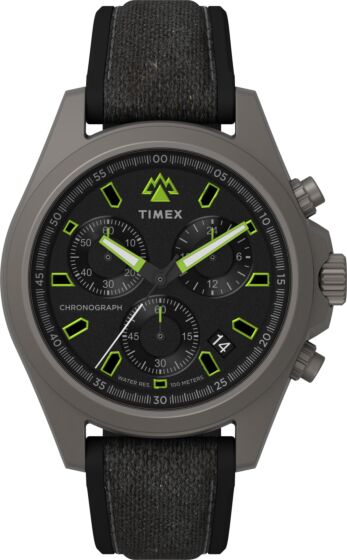 This Timex watch features a reliable quartz analog chronograph movement with a clear black dial, subdials for stopwatch function and a date window for daily use.