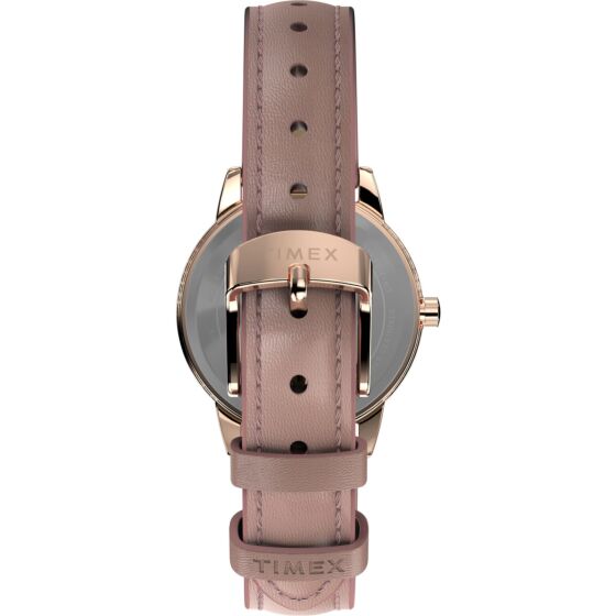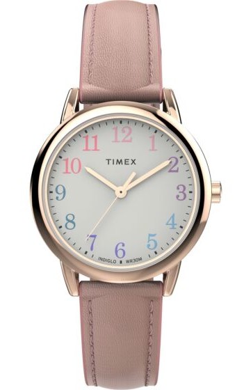 This Timex watch features a reliable quartz analog movement with a clear white dial, full Arabic numerals and a classic design perfect for everyday wear.