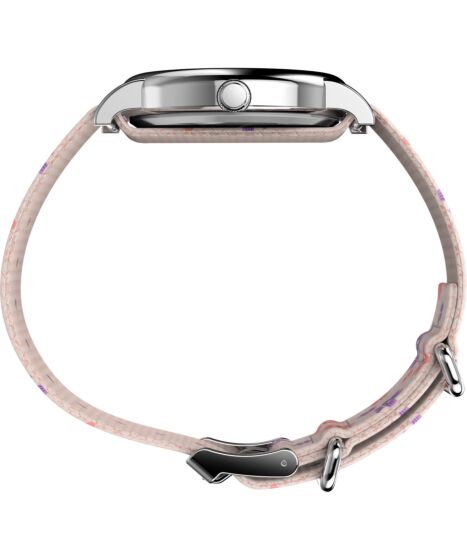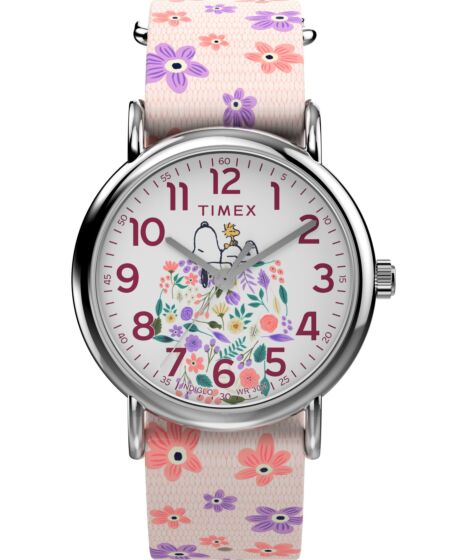 This Timex watch features a reliable quartz analog movement with a clear white floral dial, playful Peanuts Snoopy motif and an easy to read design on a multicolor fabric strap.