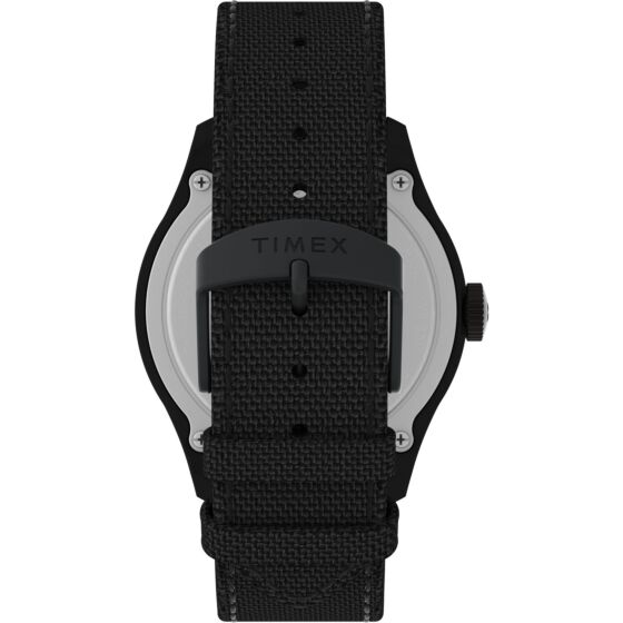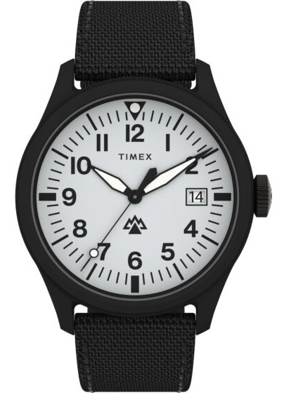 This Timex watch features a reliable quartz analog movement with a clear grey dial, date window and a durable fabric strap made from eco conscious materials for everyday outdoor wear.