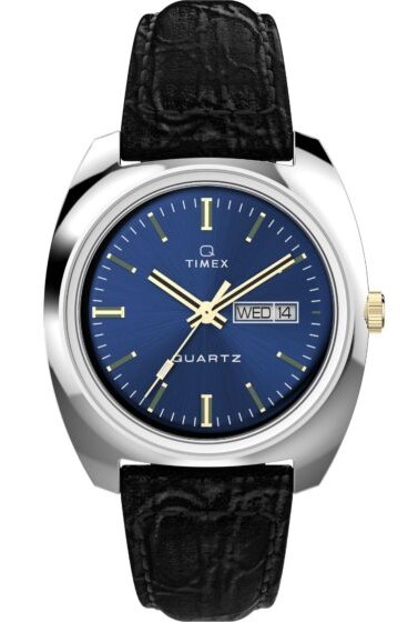 This Timex watch features a reliable quartz analog movement with a clear blue sunray dial, hand applied indices, domed acrylic crystal and a day and date window for classic everyday wear.