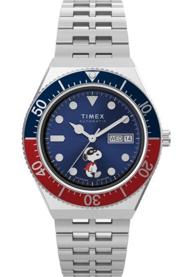 This Timex watch features a self winding automatic movement with a clear blue sunray dial that highlights a playful Peanuts Snoopy masked marvel design and a day and date window.