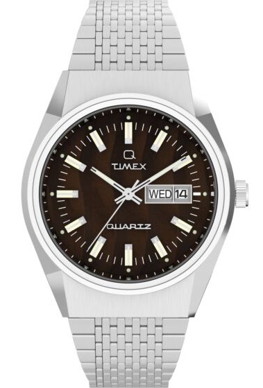This Timex watch features a reliable quartz analog movement with a clear chocolate brown Cotes de Geneve dial, full markers and day and date window for everyday wearing and vintage inspired style.