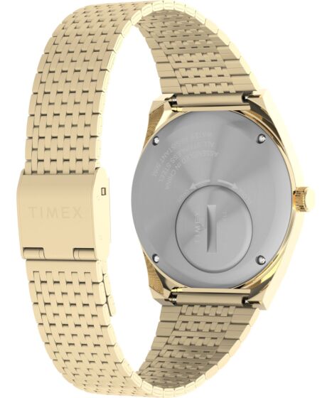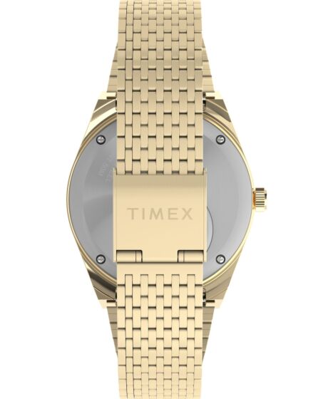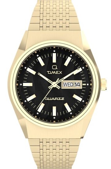 This Timex watch features a reliable quartz analog movement with a classic black dial, full markers and convenient day and date display in a retro inspired stainless steel design.