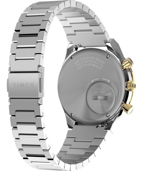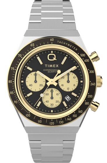 This Timex watch features a precise quartz analog chronograph movement with a clear black dial, tachymeter timing function and date display for everyday and sport wear.