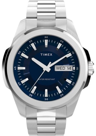 This Timex watch features a reliable quartz analog movement with easy to read hands, a bold blue dial and sleek stainless steel bracelet for everyday or dress wear.