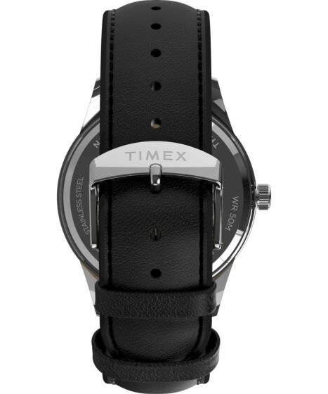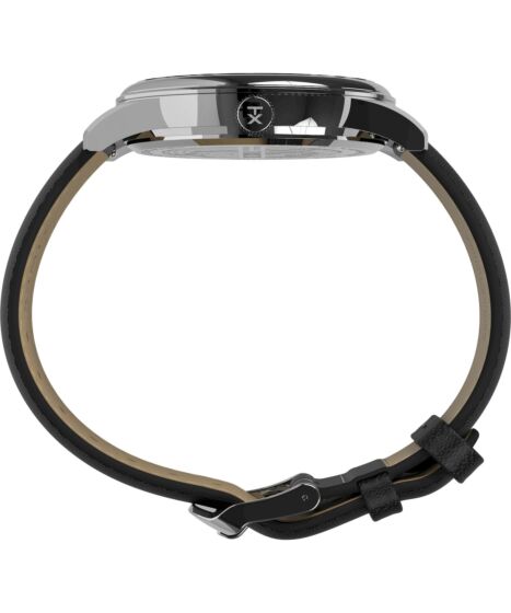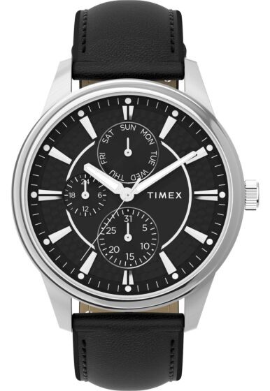 This Timex watch features a precise quartz analog movement with multifunction subdials tracking day, date and 24 hour time, a bold black dial and a genuine leather strap for everyday and formal use.
