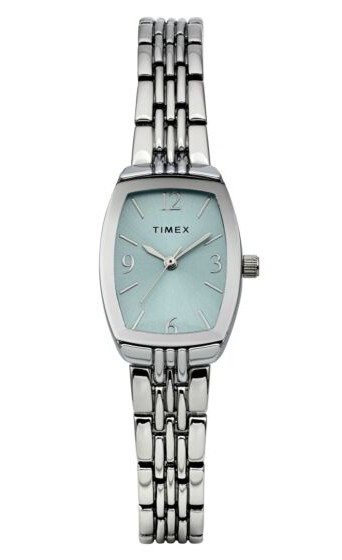 This Timex watch features a reliable quartz analog movement with an easy to read blue dial, full markers and a sleek silver tone bracelet for everyday elegance.