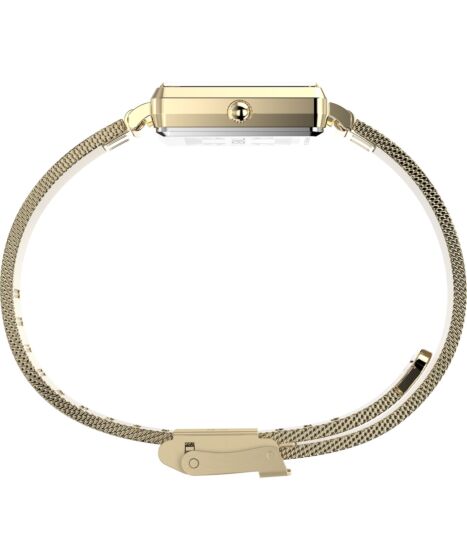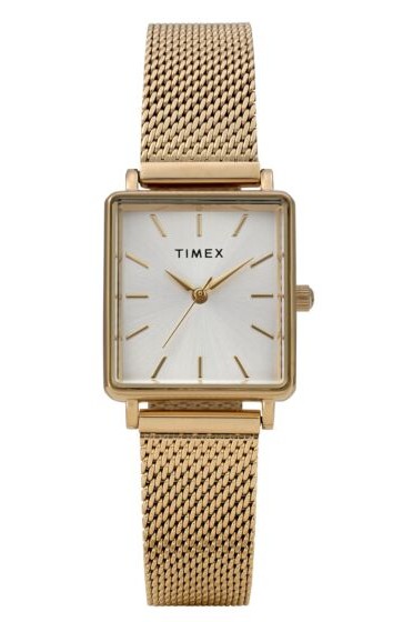 This Timex watch features a precise quartz analog movement with a clean silver dial, gold tone hands and markers and a slim rectangular case for refined everyday and dress wear.
