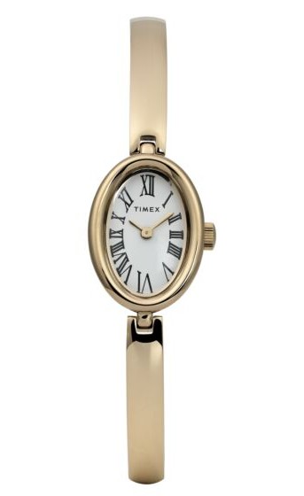 This Timex watch features a precise quartz analog movement with a clear white dial, elegant Roman numeral markers and a slender gold tone bangle bracelet for refined everyday or dress wear.